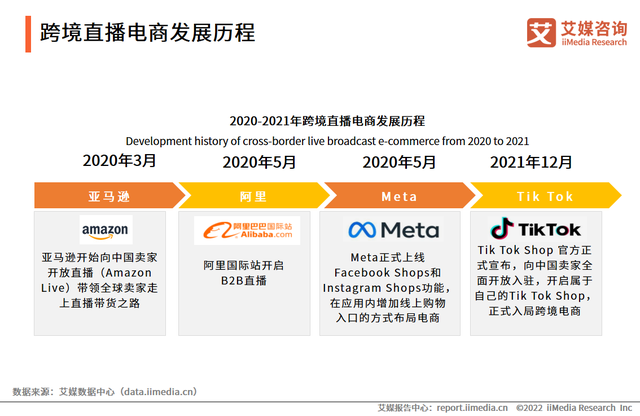 2020年在疫情的冲击下,直播电商模式全面爆发。“直播+电商”的新零售业态加速兴起,不仅影响了人们的消费方式,也助推了企业拓展境内外市场。无论是中国还是海外,直播已成当下炙手可热的流量新风口。2020-2021年,国内外知名社交、电商、短视频平台纷纷加入跨境直播电商行业,将跨境直播电商推到了一个历史高度。