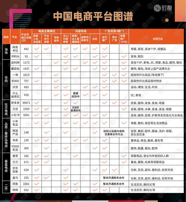 由于品类及客群的分化,不同平台的定位、玩法都不相同。时趣对目前主流的28个电商平台进行了相关梳理,以便品牌方选择匹配的电商平台进行营销。