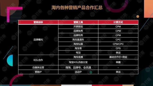 我们以淘宝为例,淘宝平台的主要营销方法有四大类:硬广合作、KOL合作、自运营矩阵、营销IP矩阵。不同营销品类下又会有具体的营销工具使用。
