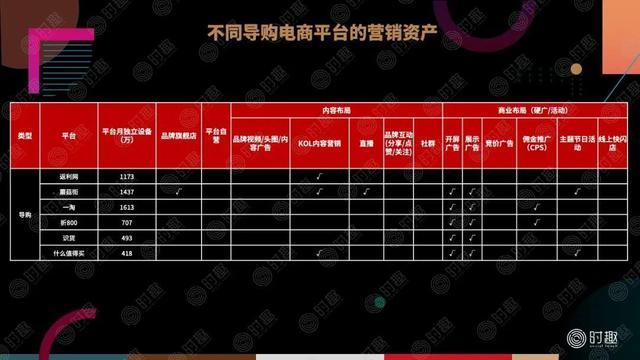 常见的导购型电商主要有什么值得买、返利网、蘑菇街、一淘、折800、识货等平台,相比于综合性电商平台,导购电商的营销工具选择更偏向于内容端。