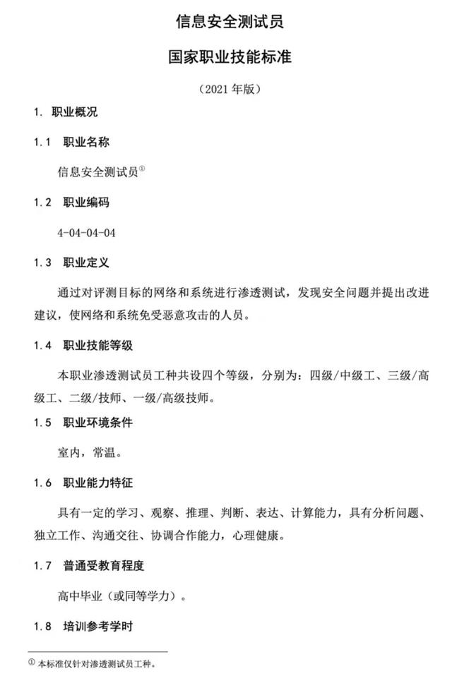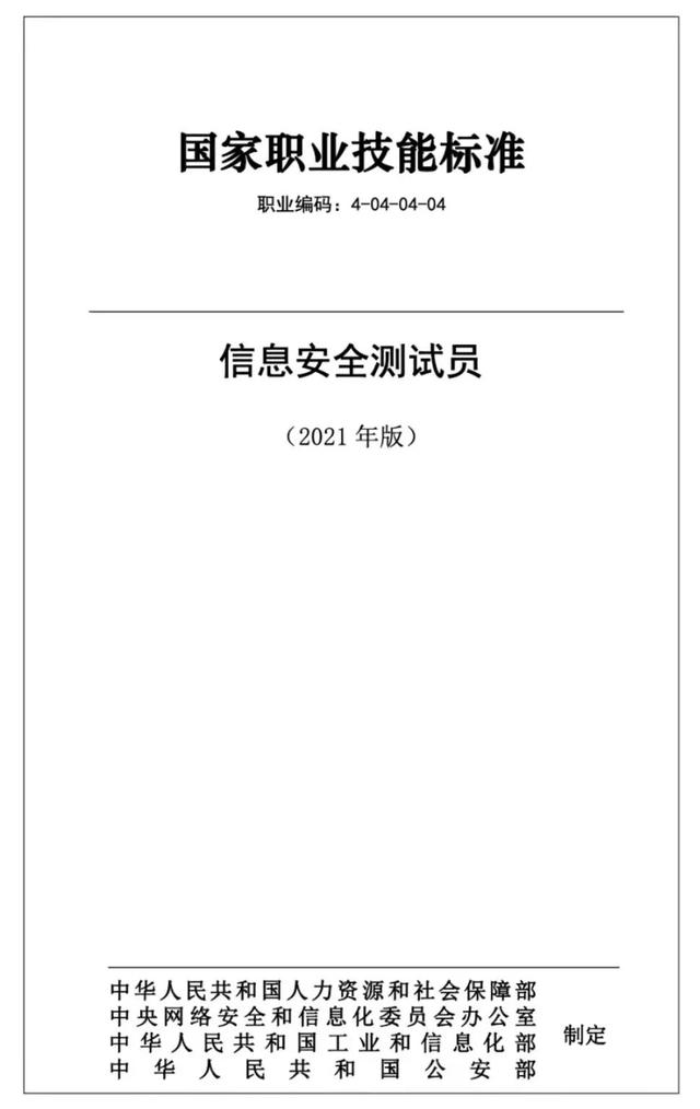 2021年11月25日,人力资源和社会保障部办公厅、中央网信办秘书局、工业和信息化部办公厅、公安部办公厅颁布《信息安全测试员国家职业技能标准》。