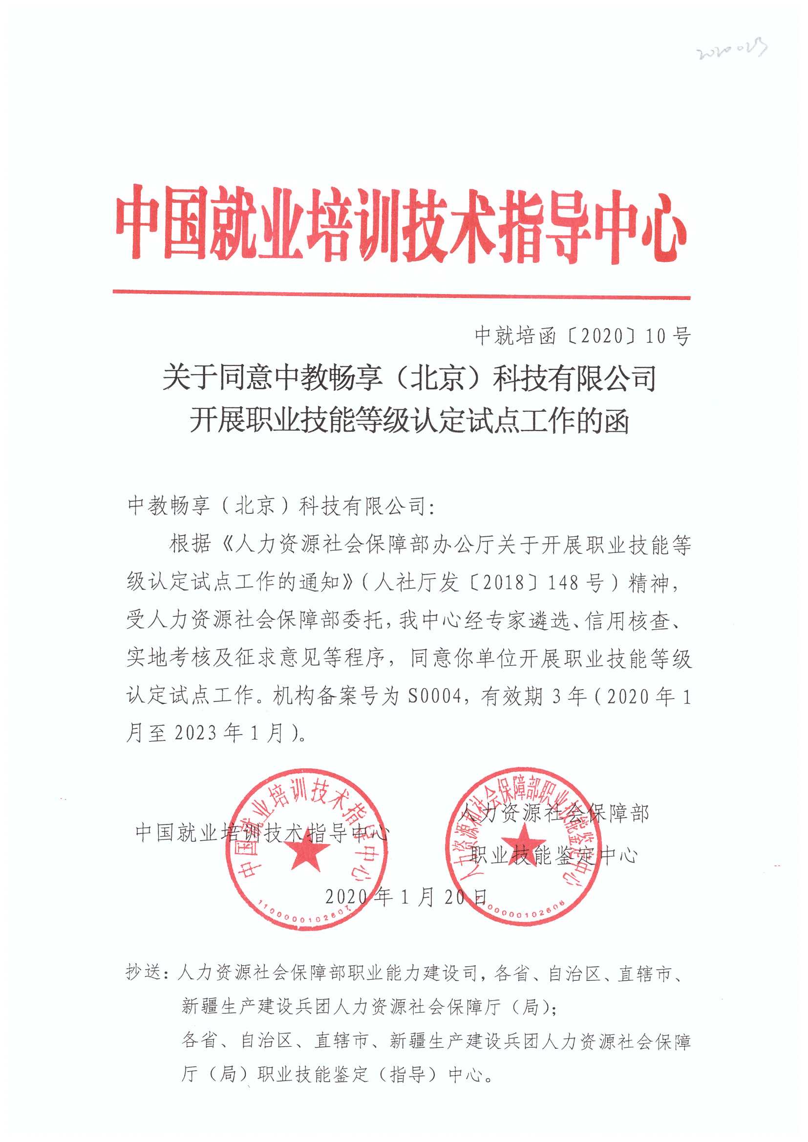关于同意中教畅享(北京)科技有限公司开展职业技能等级认定试点工作的函