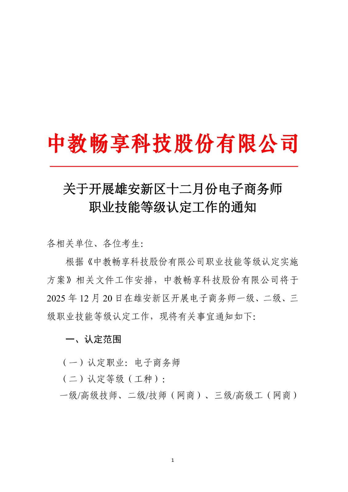 关于开展雄安新区十二月份电子商务师职业技能等级认定工作的通知