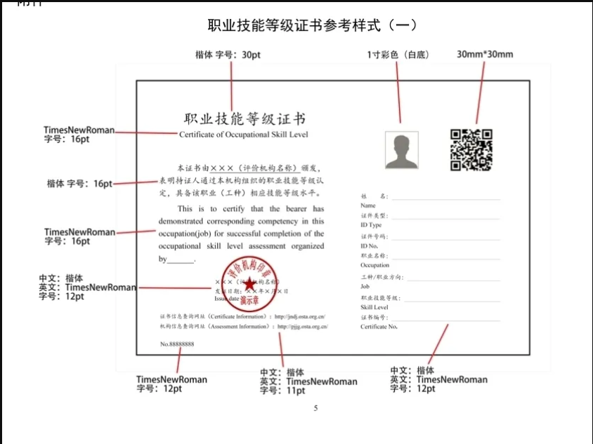 (三)上述证书样式及注意事项同样适用于电子证书,评价机构应严格执行。电子证书与纸质证书具有同等效力。证书样本(含印章内容)须在人力资源社会保障部门备案。