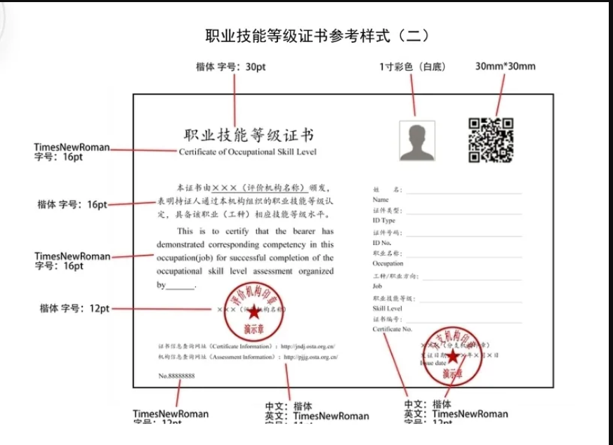 (一)证书应包括以下内容:证书名称、证书正文、评价机构名称、发证日期、姓名、证件类型、证件号码、职业名称、工种/职业方向、职业技能等级、证书编号,以及持证人照片、二维码、证书信息查询网址(http://jndj.osta.org.cn)、机构信息查询网址(http://pjjg.osta.org.cn)。评价机构可根据实际情况在证书上增加省(自治区、直辖市)人力资源社会保障部门证书查询网址和证书印制流水码。